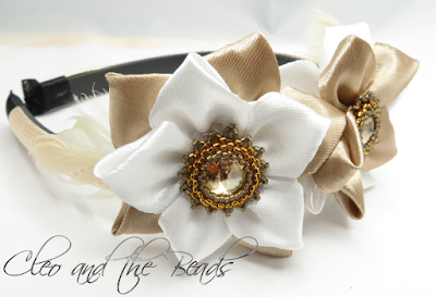 Kolejna opaska, dla tej samej młodej damy co poprzednia.Tym razem w odcieniach bieli, beżu i brązu. Oplecione rivoli to nic innego jak te kolczyki ---> Rivoli w złocie